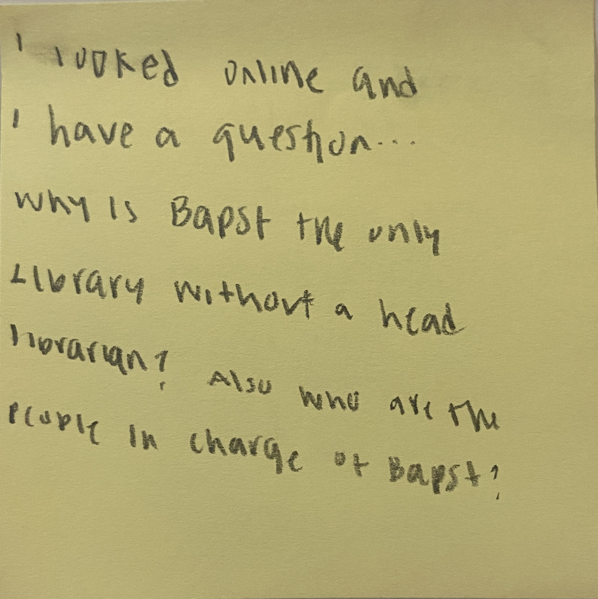 I looked online and I have a question… why is Bapst the only library without a head librarian? Also who are the people in charge at Bapst?