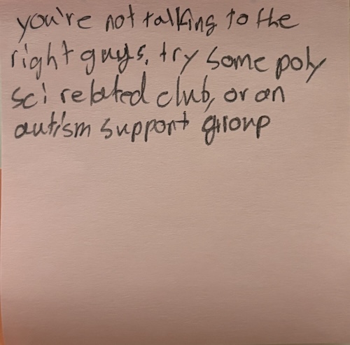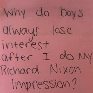 Two thoughts: 1) That may be more of a fifth date revelation. 2) If you’re doing sweaty debate Nixon, you could try the one from the movie Dick. Also, there will be boys who will get this.