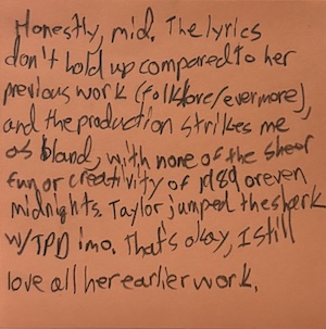I enjoyed it! It’s fun to experience how different each album is from the one proceeding. Favorite track: The Fate of Ophelia, I’m a sucker for a Shakespeare allusion.