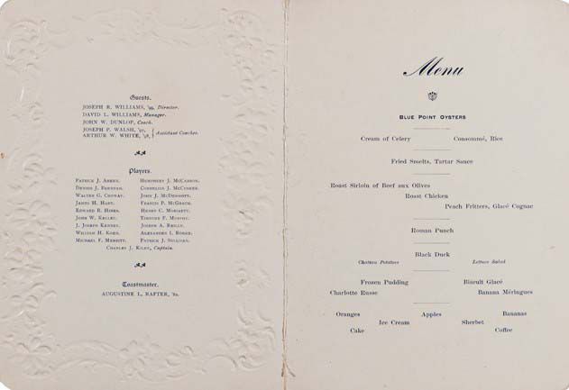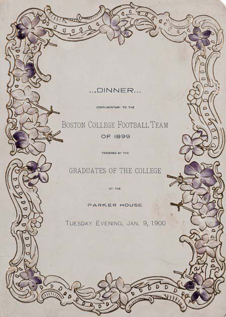The 1899 Boston College Eagles were scored on only once in ten games, and completed their football season by beating Holy Cross. Boston College Alumni honored the team at Boston’s Parker House Hotel.