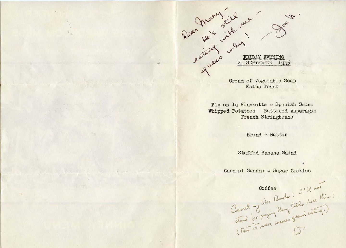 Army Chaplain William J. Leonard, SJ, and a Navy colleague improved this delightful Friday evening supper menu from an officers’ mess in Manila with smart-alecky notes before sending it home to the United States. Fr. Leonard (1909–2000) was a member of the Boston College faculty and later served as Chair of the Philosophy Department. He also was the curator of the Burns Library’s Liturgy and Life collection.