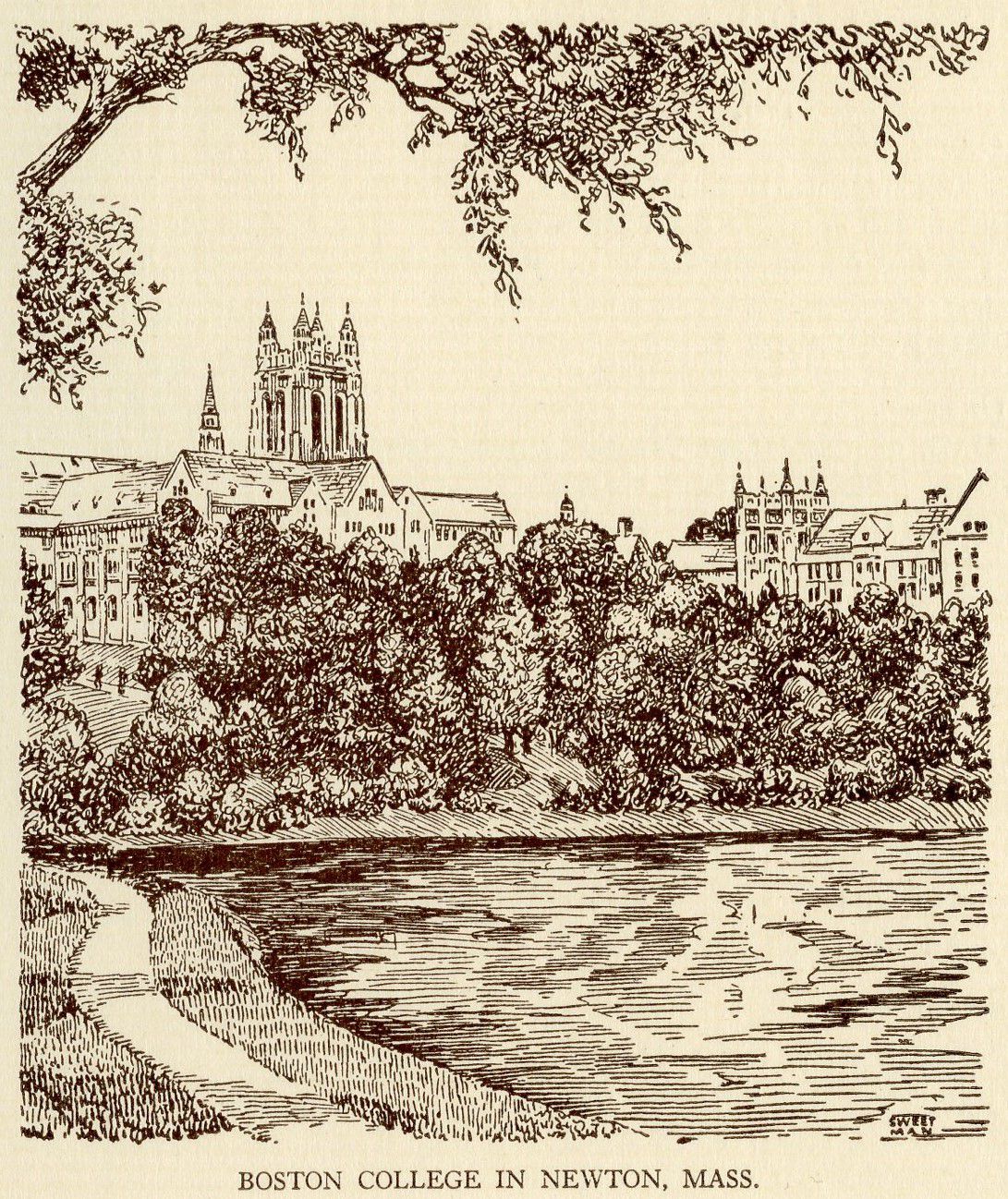 The Philomatheia Club, a women’s auxiliary group, was first organized in 1915. It was founded to “promote and foster the scholastic, athletic and social interests of Boston College.” The club’s members were mostly mothers of Boston College men, and the subsequently formed “Jr. Philomatheia” was composed of younger boosters of the college. Active until the early 1960s, the clubs regularly raised substantial amounts of money for various projects and scholarships, and supported Boston College men who fought in wars. At the home they purchased for their use – a wonderful chalet-style structure on the current site of Gabelli Hall – they held frequent social gatherings.