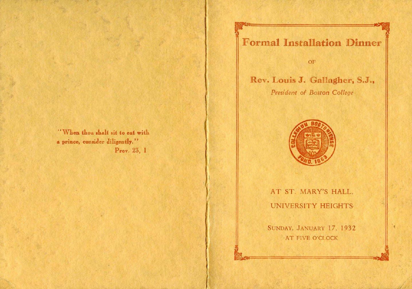 Louis J. Gallagher, SJ installation dinner menu, January 17, 1932