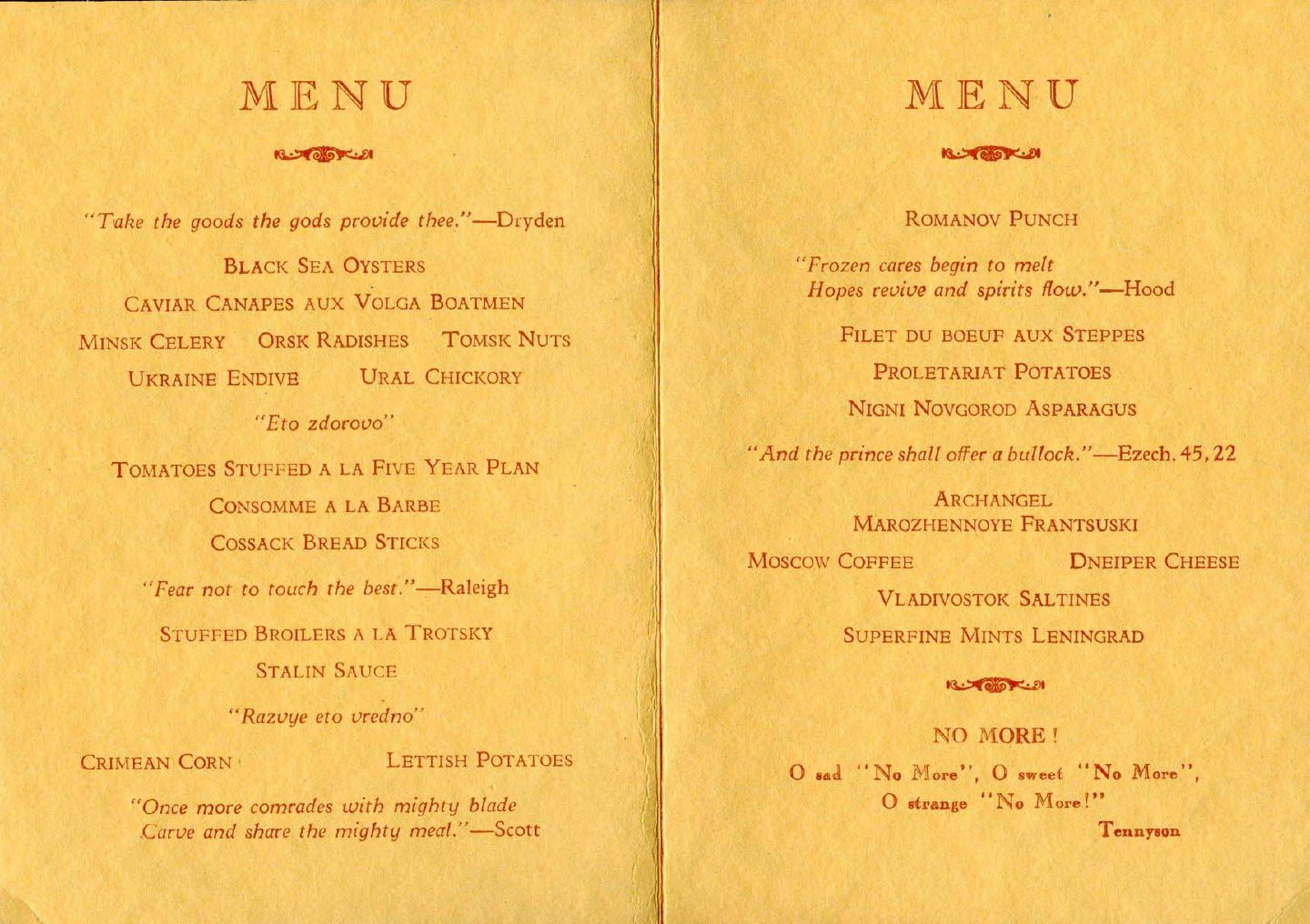The menu, below, of the “Formal Installation Dinner” of Louis J. Gallagher, SJ, as Boston College’s 17th President is adorned with literary and scriptural jokes and references to Bolshevik Russia. It illustrates his colleagues’ sense of humor as well as his former role as Assistant Director of the Vatican Relief Mission and his part in the international relief efforts following the Russian famine of 1921.