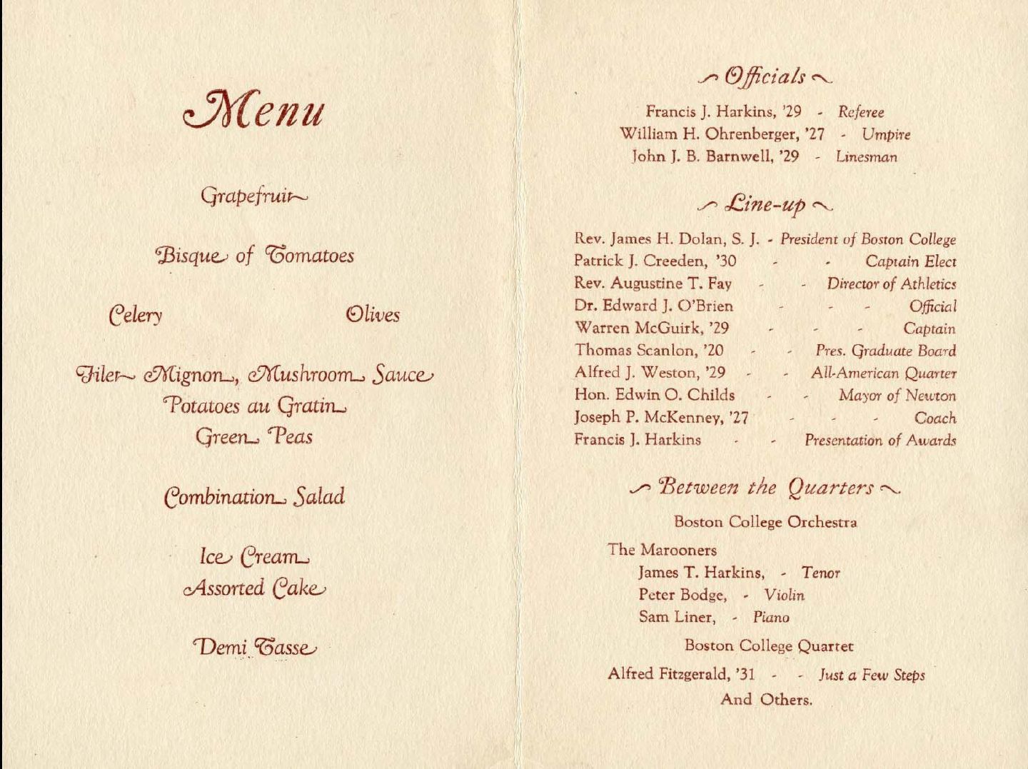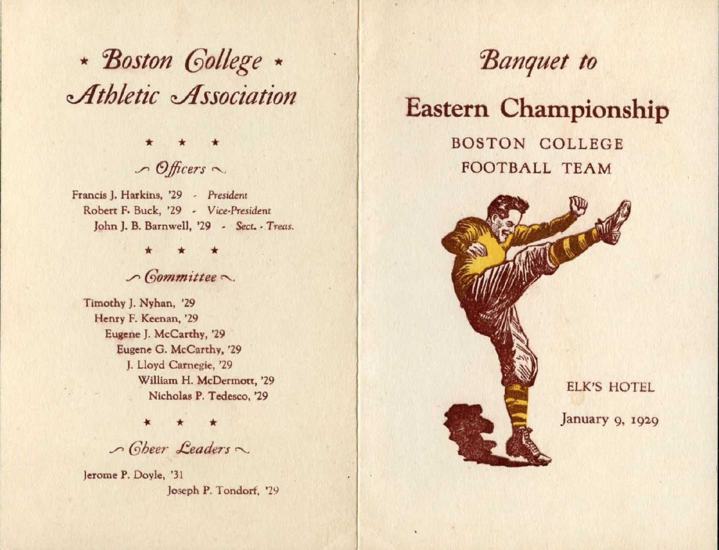 The 1928 Eagles were the season’s only undefeated football team on the eastern seaboard. A banquet for the team was hosted by the Boston College Athletic Association at Elk’s Hotel on Washington Street in Boston.