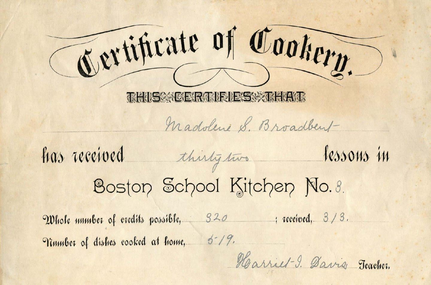 The Boston School Kitchens taught cooking in the Boston Public Schools beginning in 1885, “to humanize and refine” students and prepare them for work caring for invalids or as housekeepers. Their text book was written by Mary Johnson Bailey Lincoln, the first principal of the Boston Cooking School. The earliest school kitchens were started by wealthy individuals who donated the costs to the city. The Boston Public Schools assumed the administration of the kitchens in 1888, and by 1892 there were nearly a dozen of them scattered throughout the city. Boston School Kitchen No. 3 was at the Bowditch School in Jamaica Plain. Aside from her cooking skills, little else is known about Madolene Stanley Broadbent, the student whose photograph and certificate are seen here.