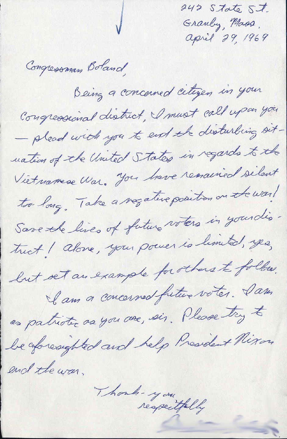 Constituent letter to Boland about ending the Vietnam War, 1969.