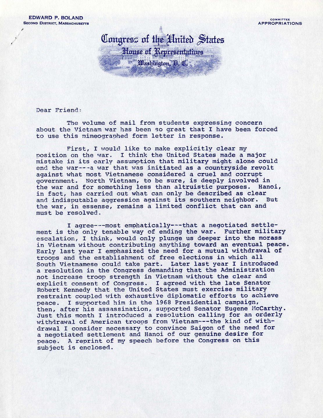 Boland form letter responding to proposed ending of Vietnam War, circa 1969.