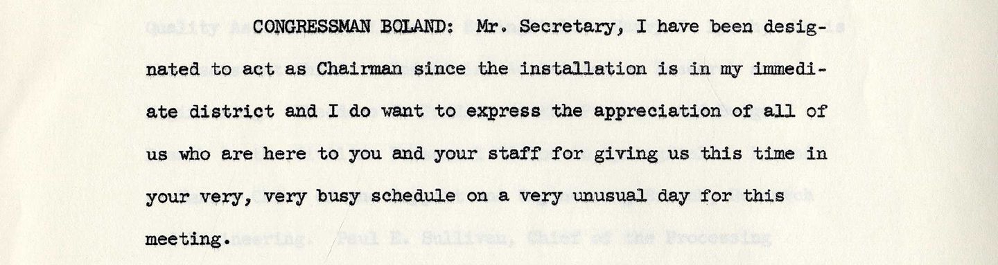Boland’s testimony at Massachusetts Congressional Delegation meeting with Secretary of Defense Robert S. McNamara, 1965.