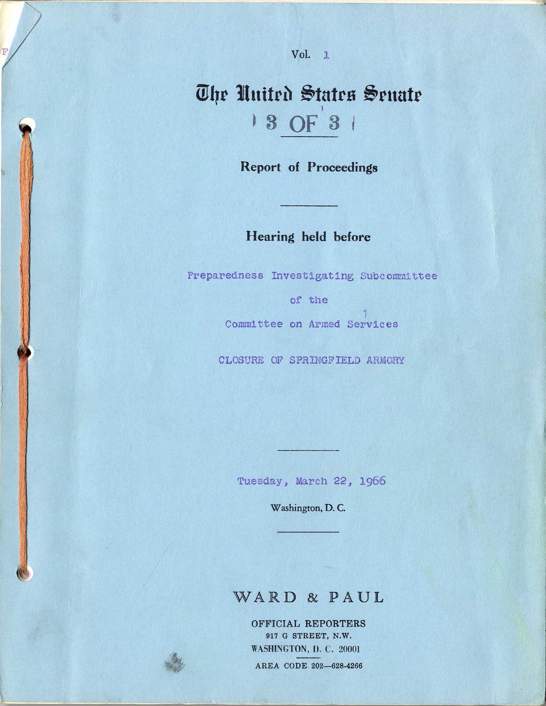 Preparedness Investigative Subcommittee of the Committee of Armed Services report on the Closure of Springfield Armory, March 22, 1966.