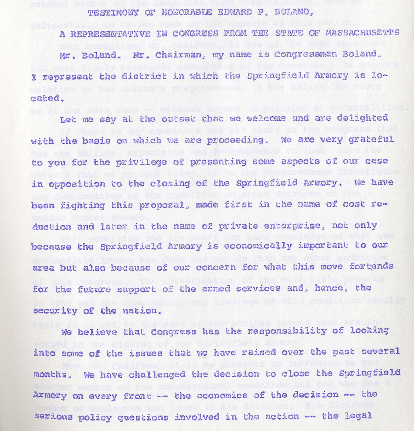 Boland’s testimony for Preparedness Investigative Subcommittee of the Committee of Armed Services report on the Closure of Springfield Armory, March 22, 1966.