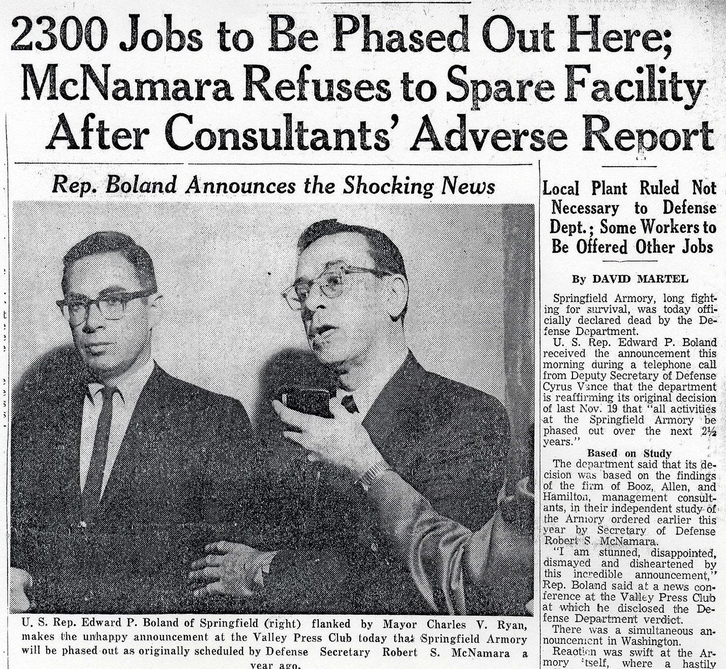 Even an independent consultant report stated that the Armory closure would have an adverse impact on the economy, but McNamara was not swayed by any of the arguments. After a long fight, Boland was forced to concede that the Armory would close in 1968.