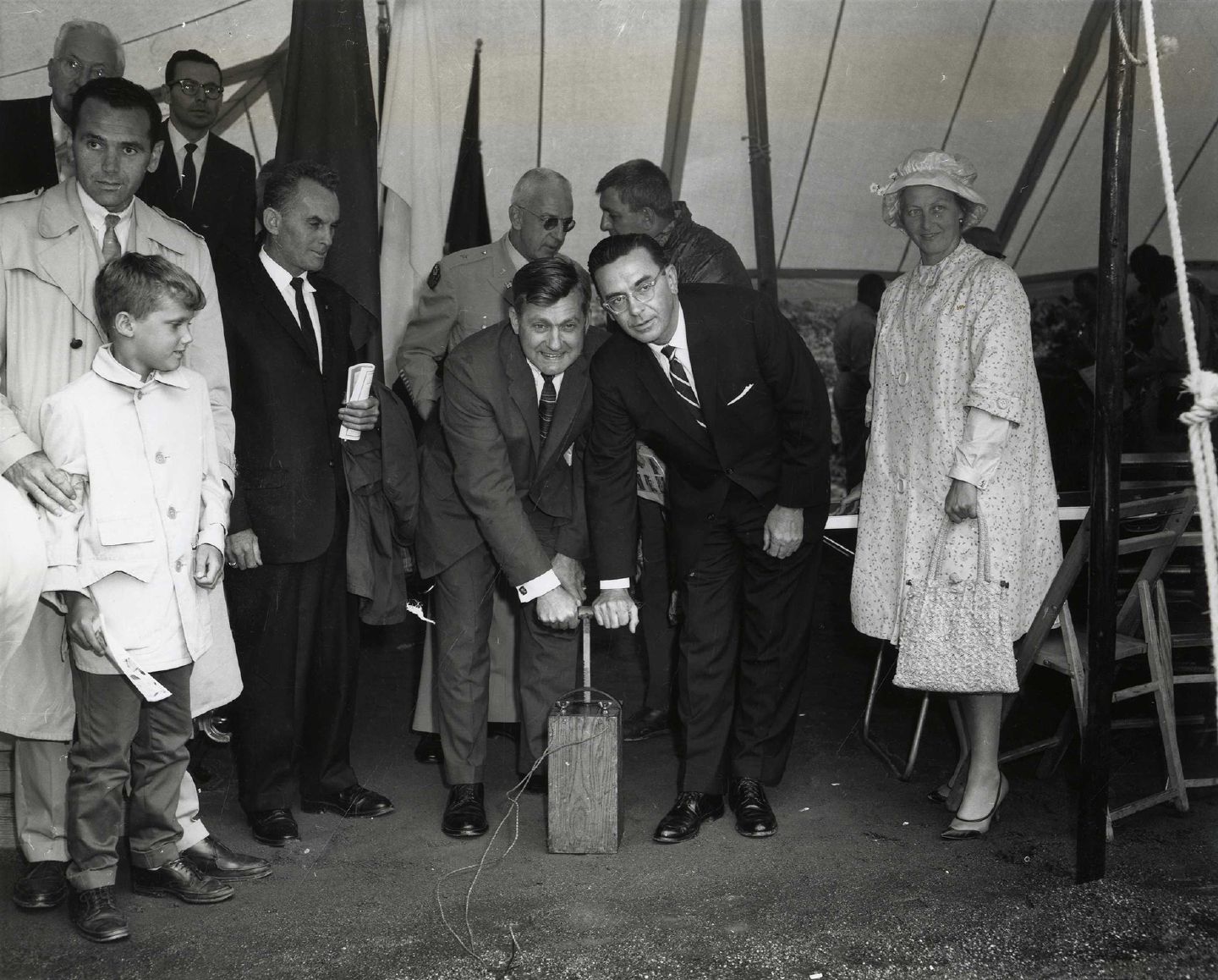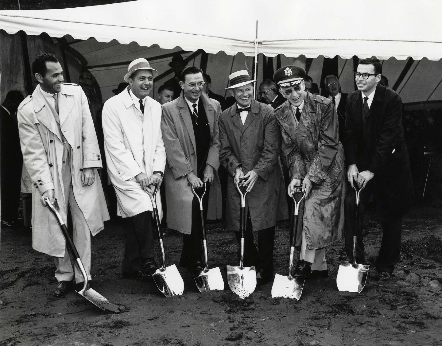 Boland with Mayor John D. O’Connor, Congressman Silvio Conte, Governor John A. Volpe, Brigadier General Seymour A. Potter, Leonard J. Collamore at Littleville Dam groundbreaking, August 10, 1962.