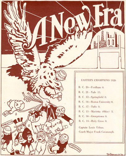 Cartoon of an eagle knocking a Holy Cross football player from the top of Gasson Tower.