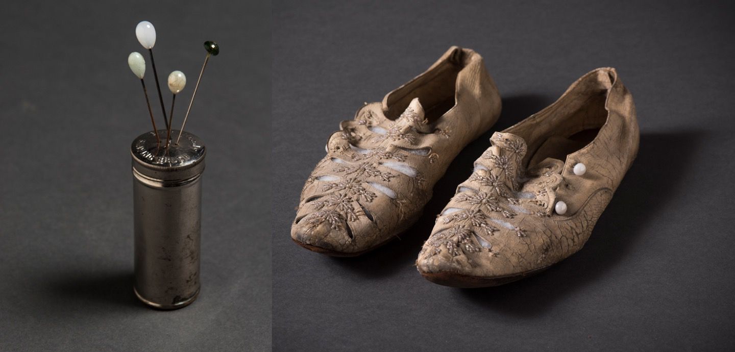 Martha Moore Avery’s hatpins in holder and shoes, circa 1890s-1929.