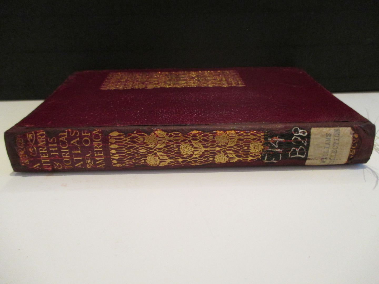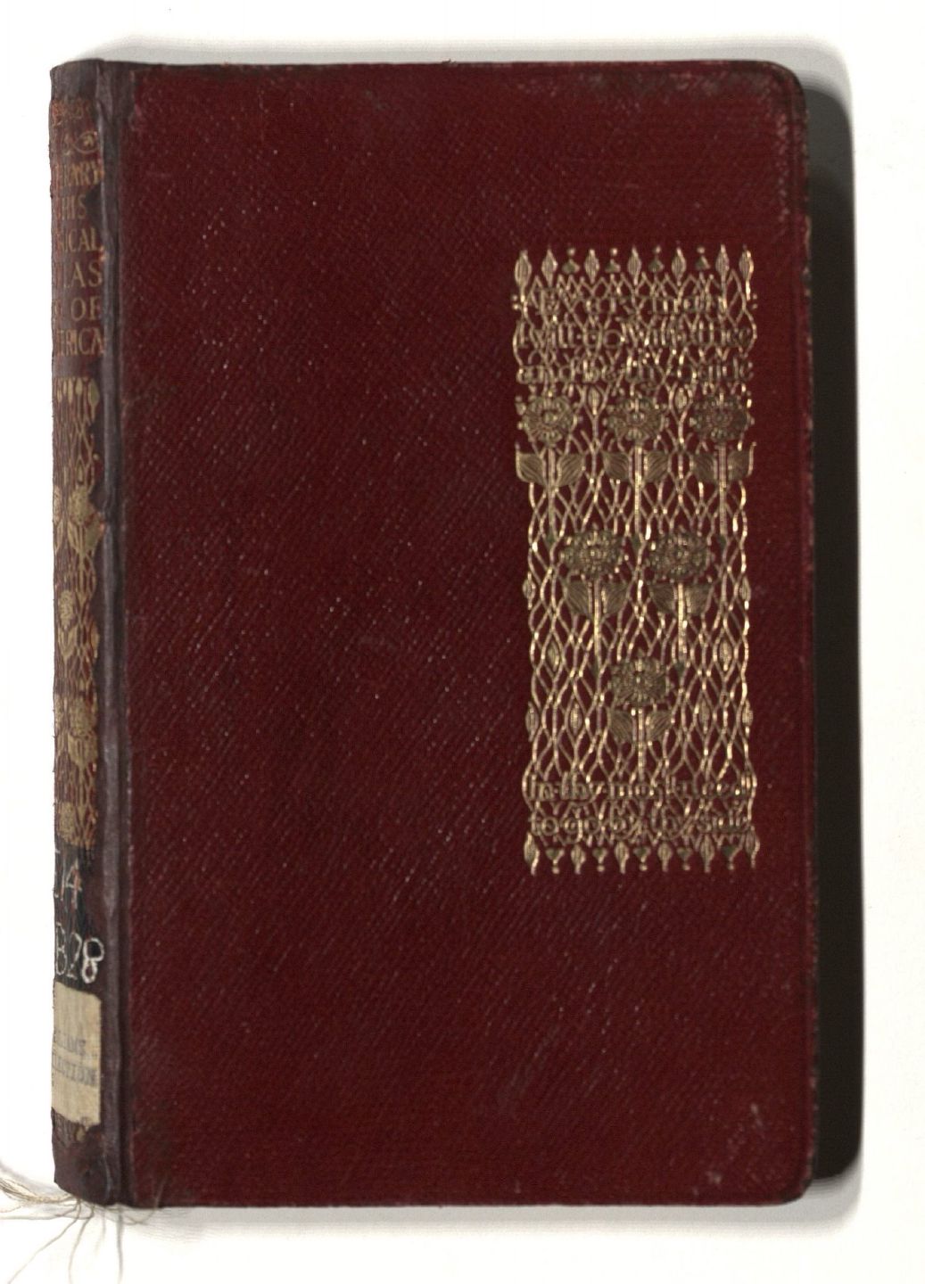 This 1911 edition of A Literary and Historical Atlas of America is from the Reference category of EML. The spine design is identical to other contemporary editions, but it also includes a matching gilt floral design on the cover. It is bound in maroon leatherette, has gilt top pages, and is also bound with a silk ribbon book marker. This volume is from the Williams Collection.