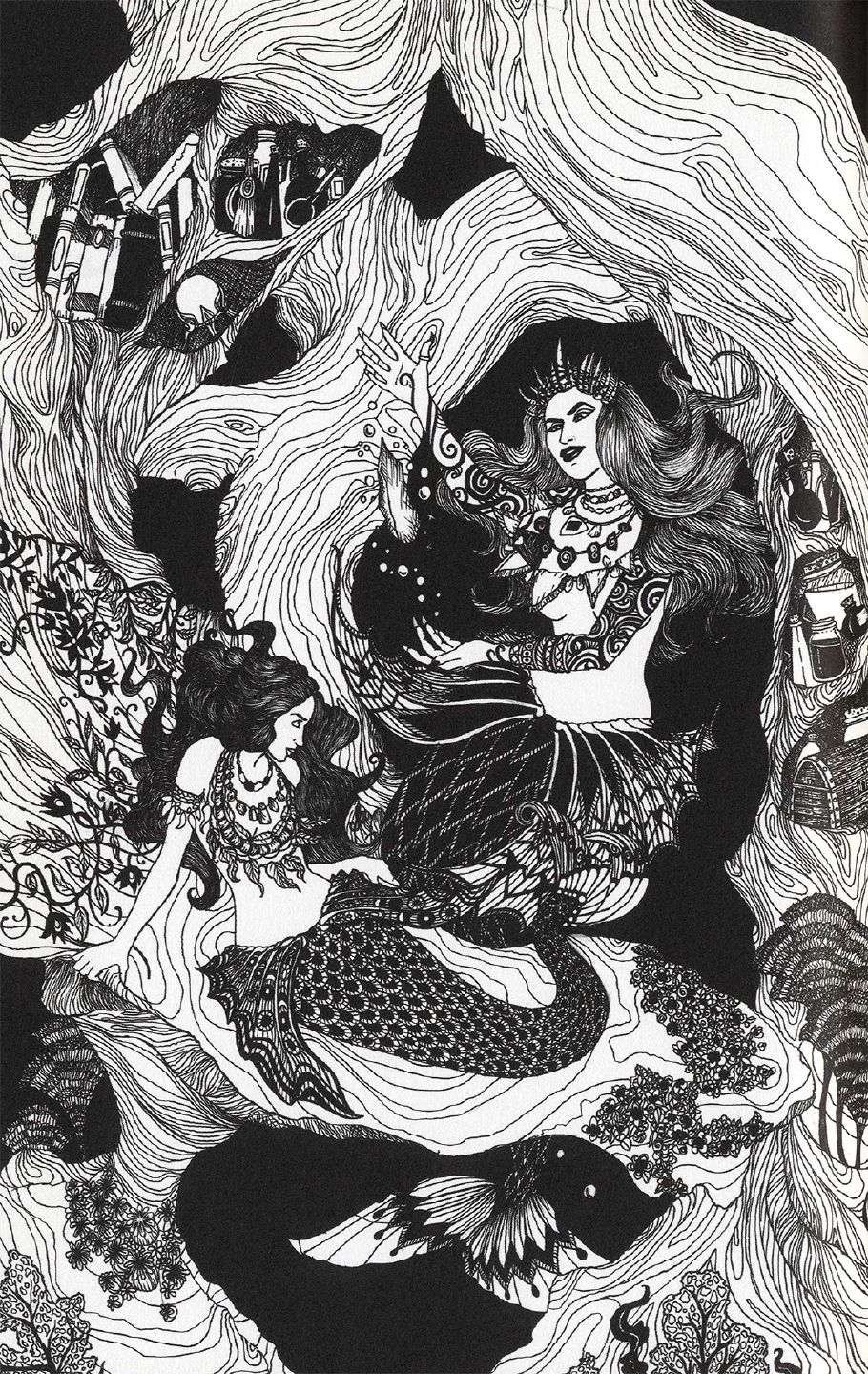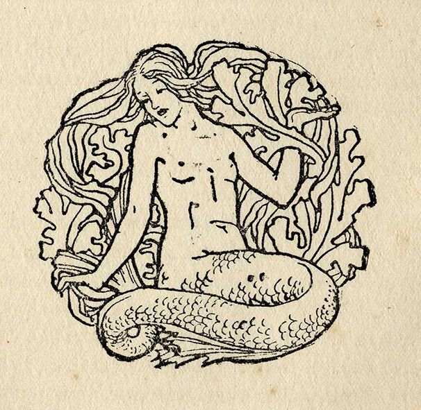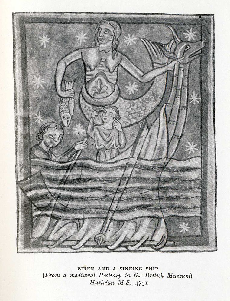 “Mermaid,” according to Patten’s entry, was: “At first a symbol of man whose speech is fair but whose deeds are treacherous. But many believed the mermaid –part women and part fish, was a symbol of the union of the divine and human natures.” He also includes more common meanings associated with mermaids, such as “the story of sailer dragged down to the bottom of the sea by mermaids,” “sea mothers,” “wisdom”, “mother of the world,” and “symbol of seduction.” Similarly, Sirens are described as representing virtues and vices of human nature, as well as showing the “delusive nature of human pleasures.” These beautiful women are repeatedly connected to death (dragging men to watery graves, entrapping souls to the sea, being actual “spirits of death”), which sharply contrasts and connects both beauty and despair, life and death.