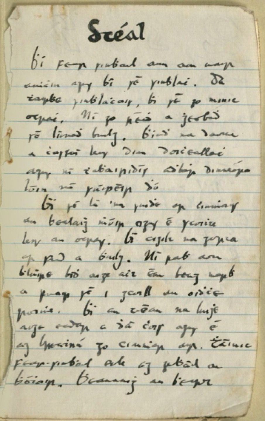 Although O’Nolan lambasted policies aimed at making all Irish citizens Irish speakers, he nevertheless cherished the language and wanted to promote its literary heritage and expression. He also applied his imaginative inventiveness to schemes for developing a practical, modern Irish typeface, occasionally doodling Irish letterforms on the margins of his manuscripts and even proposing to the Underwood Typewriter Company how its standard keyboard could be modified to include new characters to represent certain sounds unique to the Irish language.