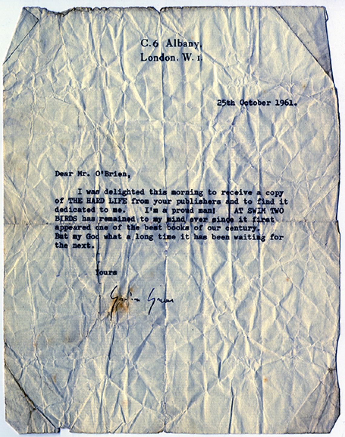 With a Joycean compounded pun, O’Nolan dedicated The Hard Life (his “misterpiece”) to Graham Greene in gratitude for his recommending the initial publication of At Swim-Two-Birds, no doubt with the hope of further promotional favor. Greene was flattered, but did not offer any critical endorsement.