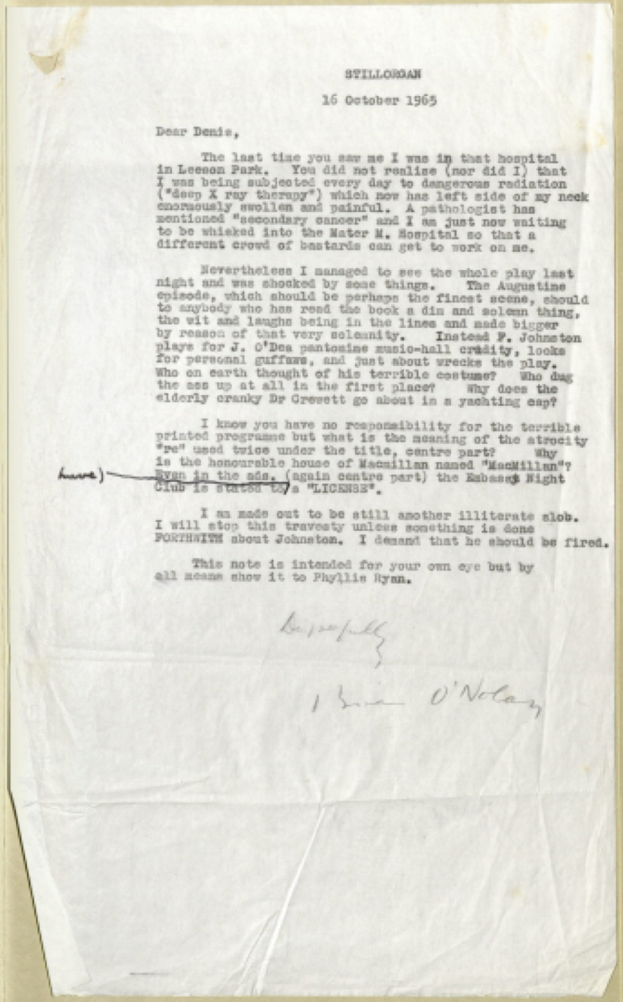 Brian O’Nolan TLS to Denis Carey, 16 Oct 1965