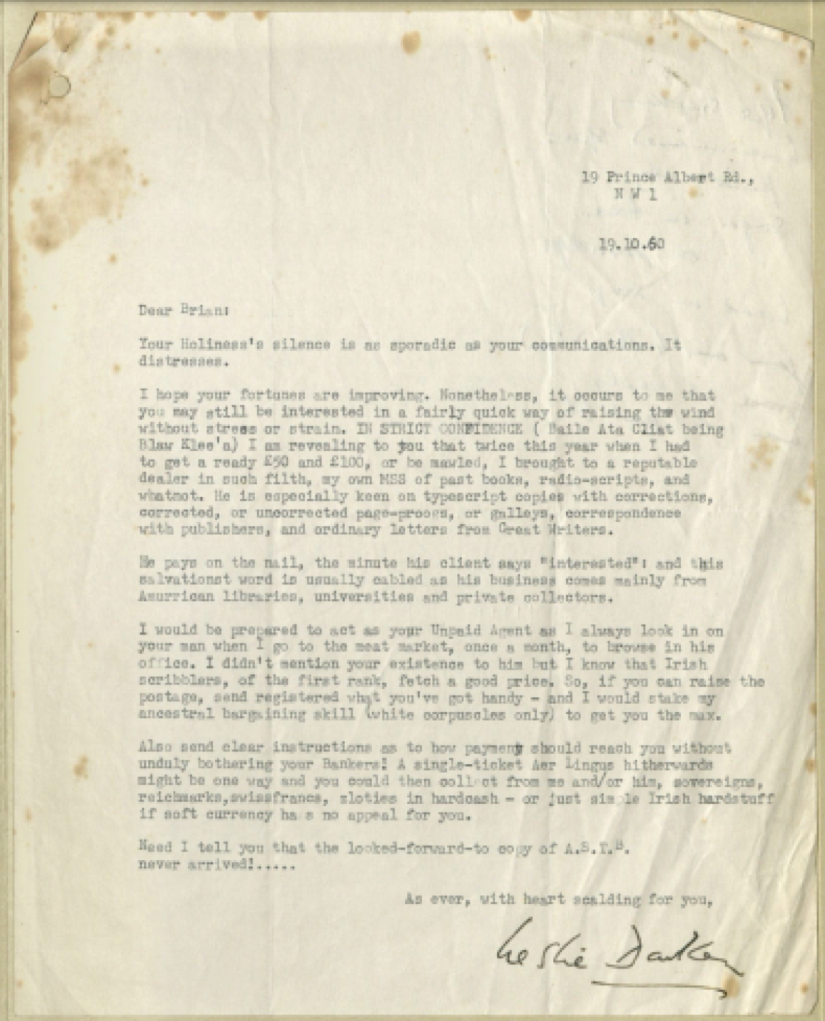 Leslie Daiken to O’Nolan, 19 Oct 1960, re: brokering sale of mss. to America