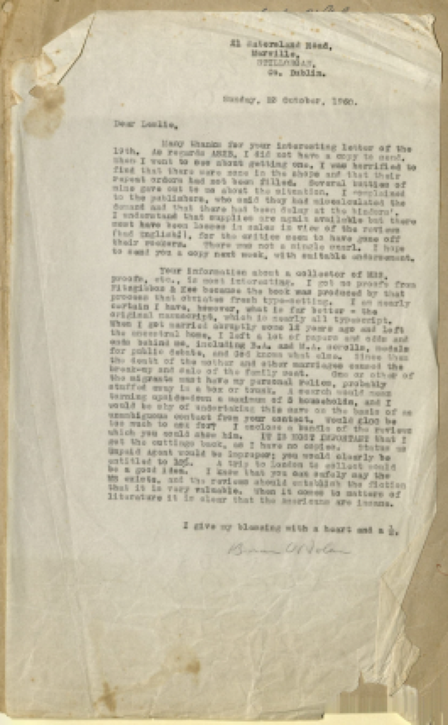 O’Nolan carbon copy letter to Leslie Daiken, 23 Oct 1960 re: sale of mss. to America