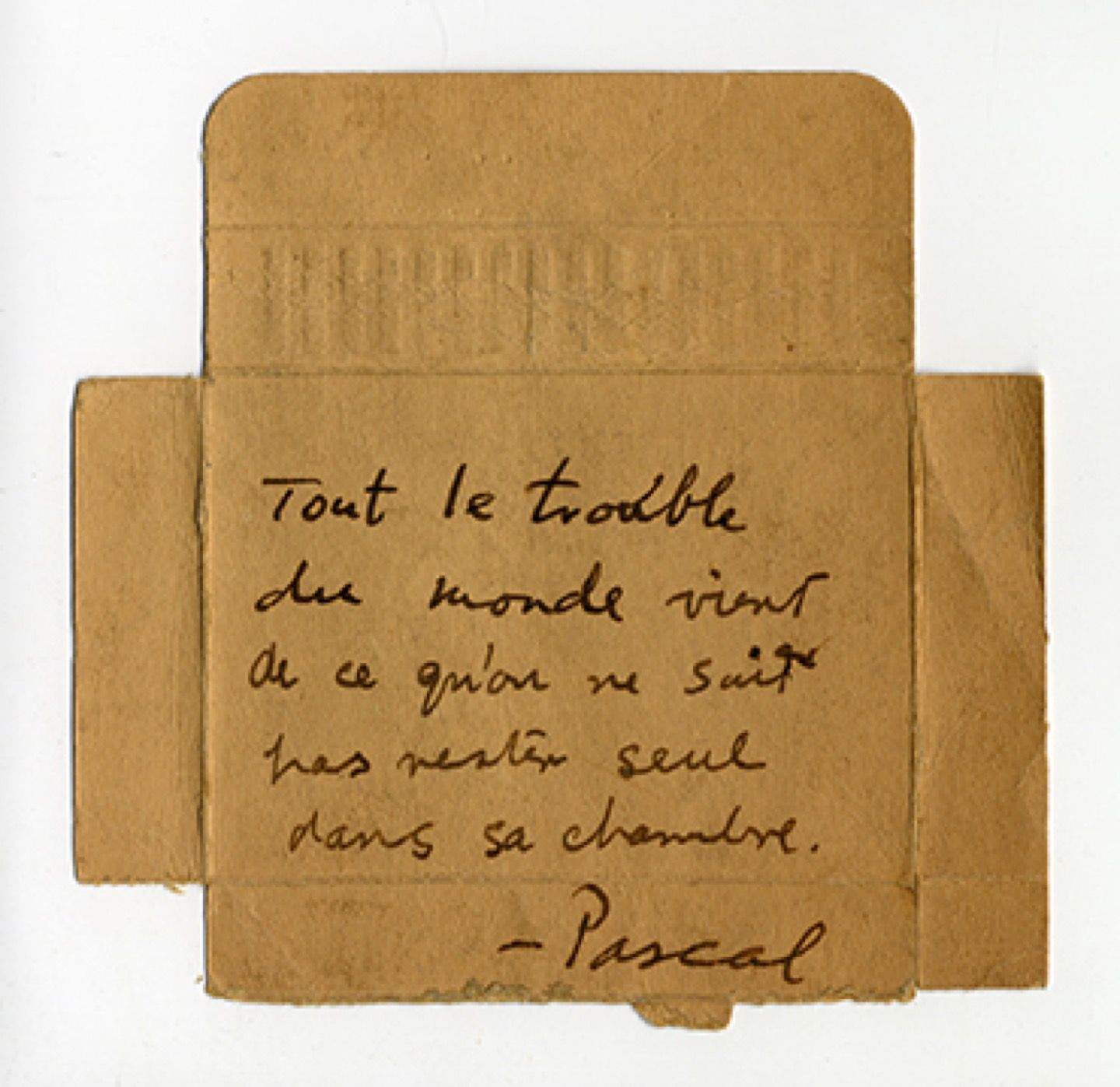 Yet another acquaintance (surely a Frenchman by his handwriting style) jotted on a cigarette box a loose quotation of one of Pascal’s aphoristic pensées, which O’Nolan used as an epigraph for his comic novel: “all the world’s problems come from not knowing how to sit alone in one’s room.”