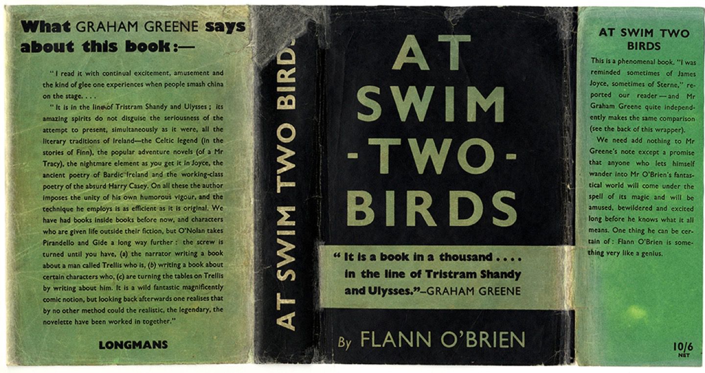 Published in London in 1939 by Longman’s at the recommendation of Graham Greene, O’Nolan’s debut novel as Flann O’Brien garnered praise from other writers, if not critics, including a coveted endorsement from none other than James Joyce. Meanwhile a piqued Seán Ó Faoláin, with whom “Flann” had lately sparred in the editorial pages of The Irish Times, commented in a review that it “had a general odour of spilt Joyce all over it.” Gun shy, O’Nolan attempted to withdrew the suggestion he had made to Longman’s to publish the novel using the pen name he had since turned on Ó Faoláin, but it was too late: the genie could not be put back in the ink bottle.