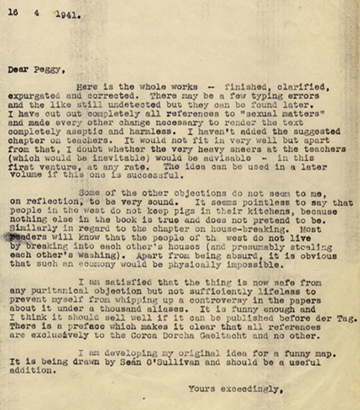In a letter to Gough dated 16 April 1941, O’Nolan reports on his attempts to address readers’ comments by excising “all references to ‘sexual matters’” and otherwise rendering the revised text “aseptic and harmless.” Browne and Nolan nevertheless declined to publish the work, but it was brought out later in the year by An Press Náisiúnta (The National Press).