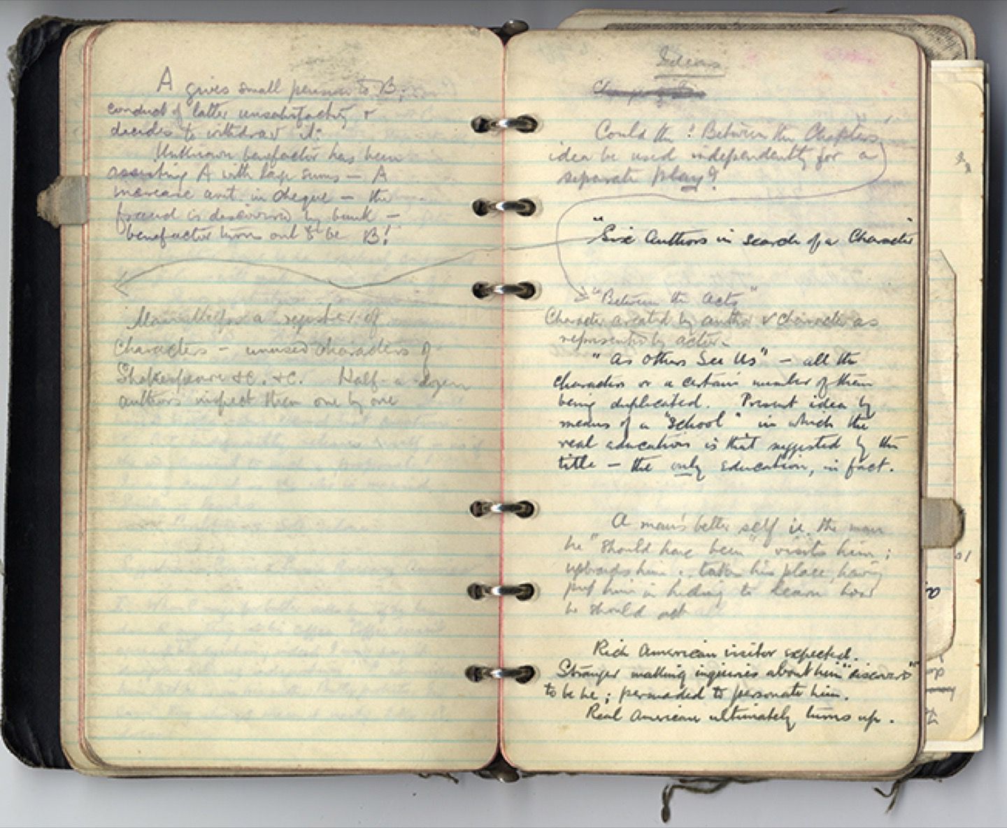 In a notebook that belonged to O’Nolan’s father, various plot ideas are sketched out in pencil and pen. A twist on Luigi Pirandello’s 1921 play “Six Characters in Search of an Author” may represent a germ of the metafictional premise around which his first novel, At Swim-Two Birds, is constructed, with characters from different subplots coming together to conspire against the narrator. O’Nolan toyed with a similar idea of fictional characters rebelling against their creator in a story he wrote he published in the UCD literary magazine Comhthrom Féinne.
