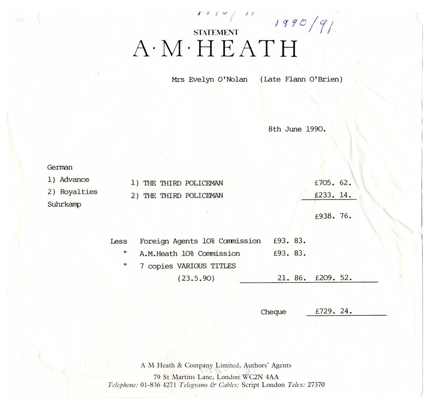 Advance and Royalties Statement for The Third Policeman