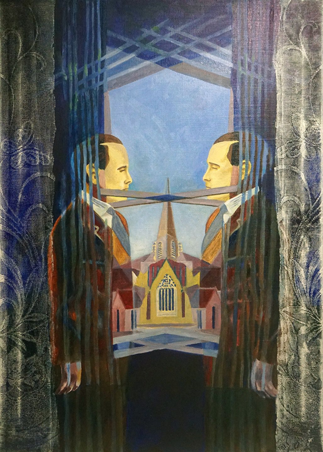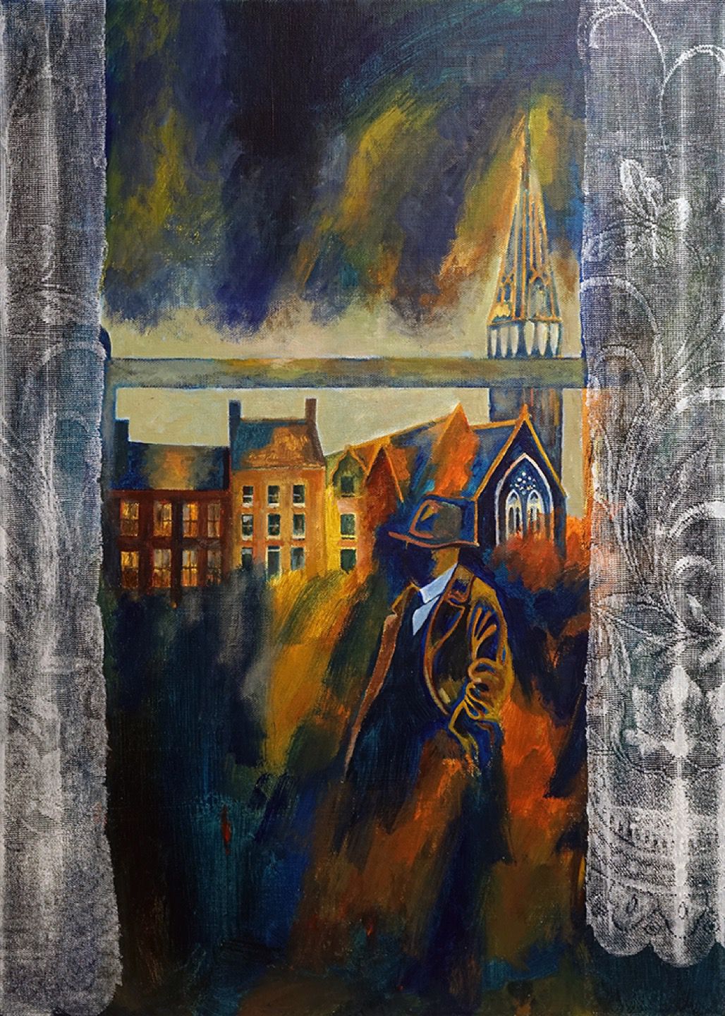 My artwork references the influence of O’Nolan’s youth in Strabane. The writer looks through the framing device of the windows and lace curtains of his birthplace at the townscape that surrounds it. The artworks also address the question of identity and the use of multiple personae in O’Nolan’s writings.
