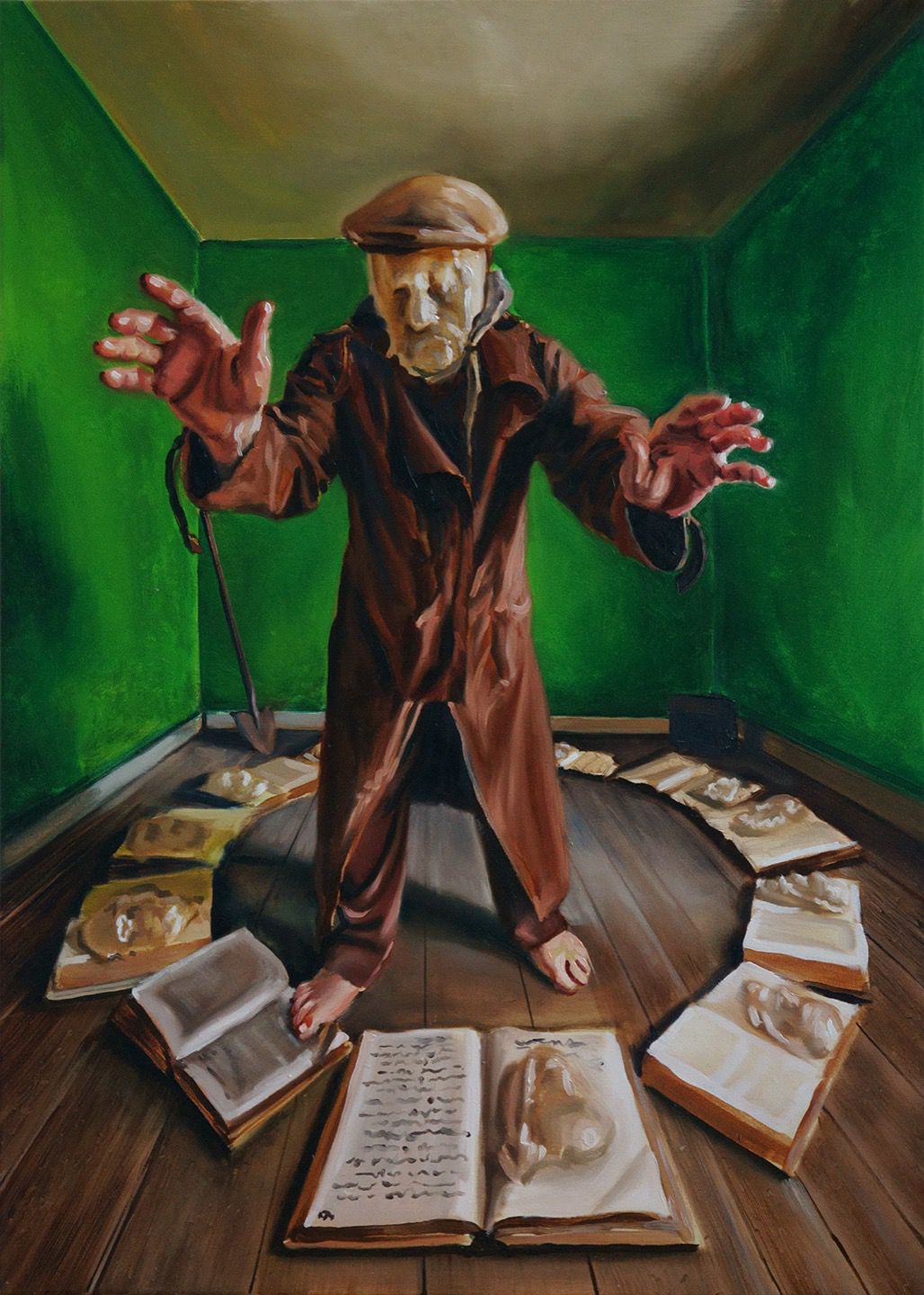 Rather than illustrating O’Nolan’s writings, my paintings form a dialogue with the ideas and absurd, surreal worlds that he created. The paintings also have a symbiotic relationship with my animated and video artworks. In some cases the paintings act as malleable props within the animated mise-en-scène; in others, the videos suggest compositions for painting.