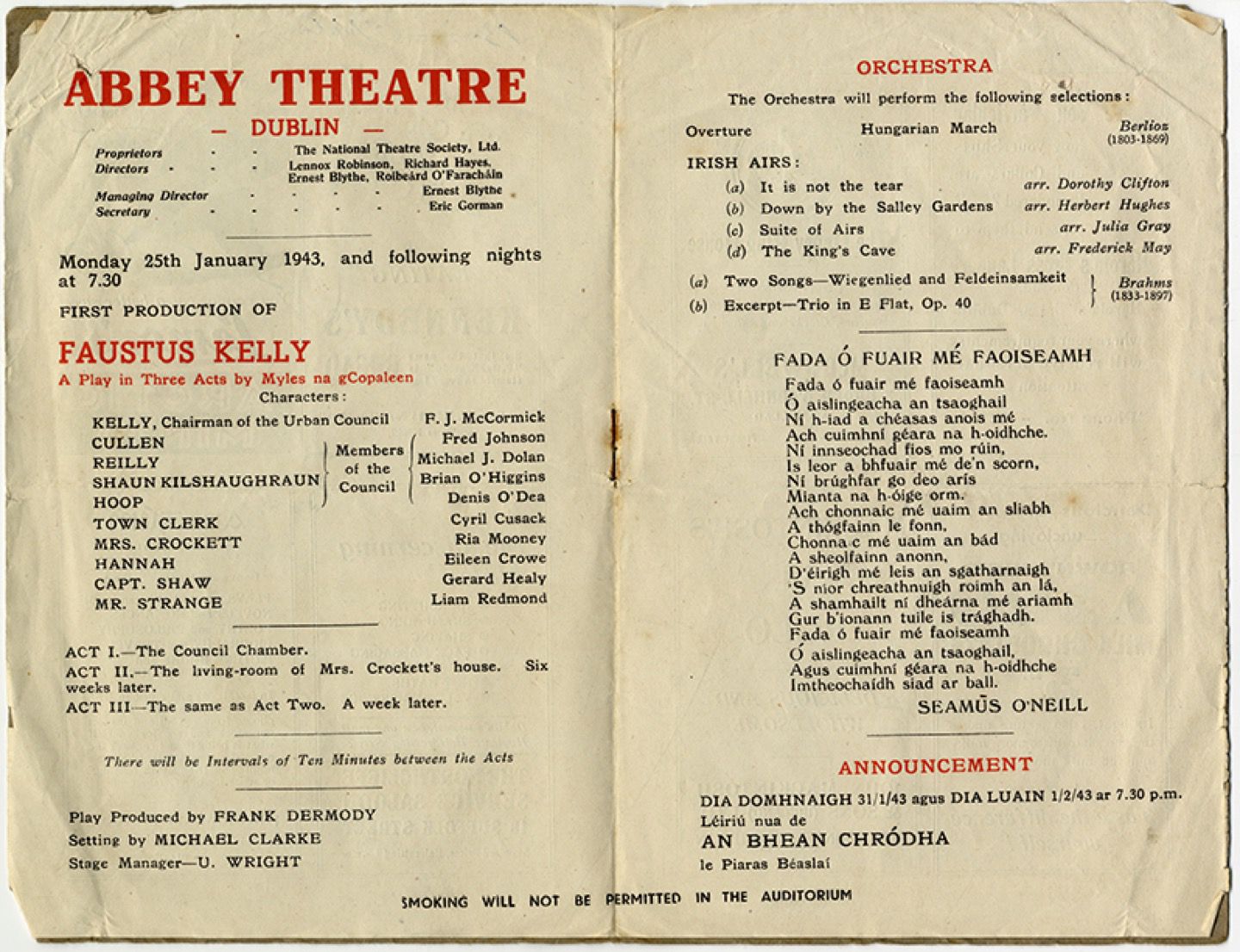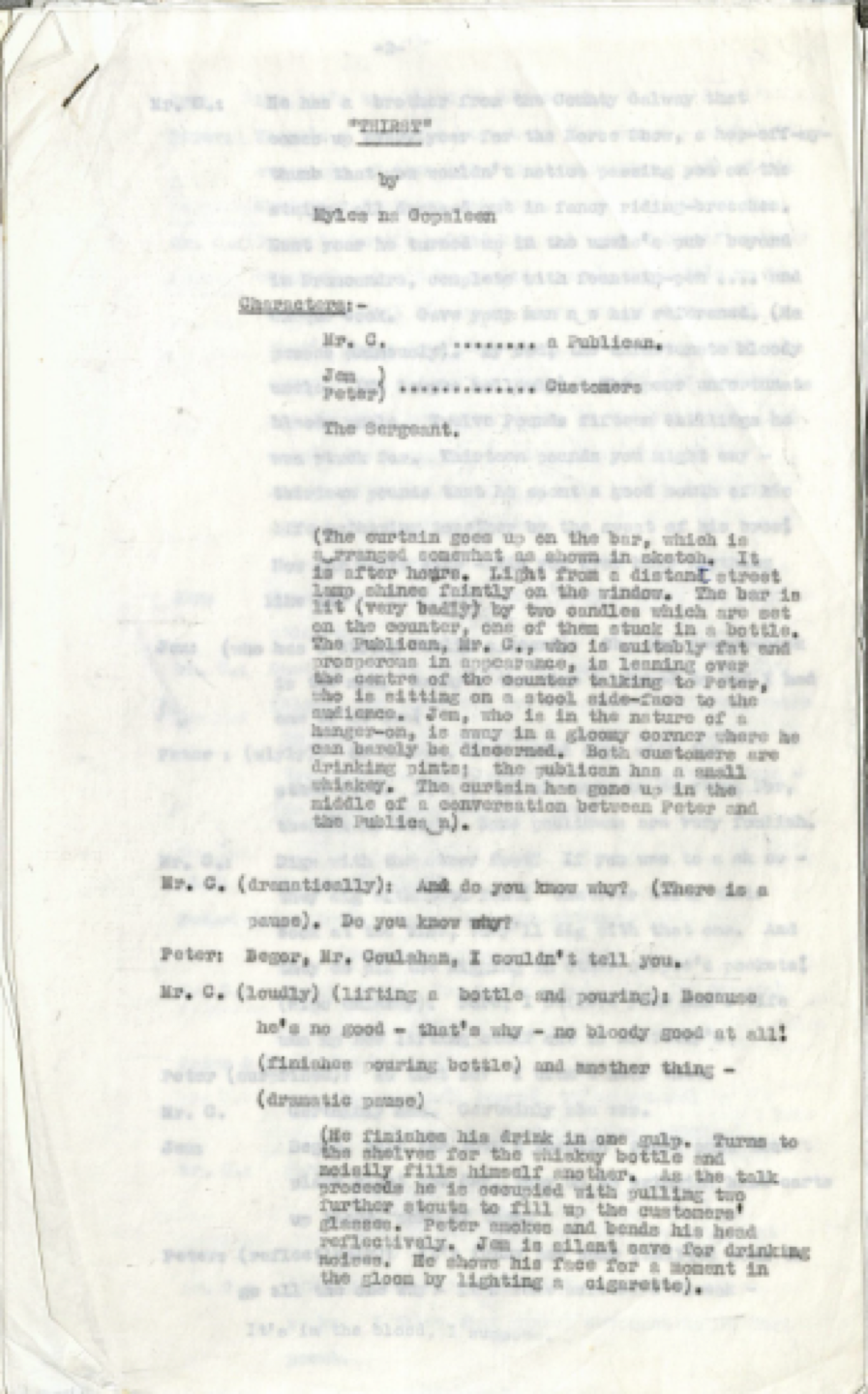 Two of O’Nolan’s plays were staged at the Abbey Theatre in early 1942, Faustus Kelly, a parody of the German legend, and an adaptation of The Insect Play by the Brothers Čapek. Both were box office failures, but later that year O’Nolan had better success with a one-act play titled Thirst. It was staged at the Gate Theatre as part of a Christmas variety program intended to lift public spirit during the otherwise dark years of the Second World War. A barroom story with popular appeal, Thirst was subsequently adapted for radio and television.