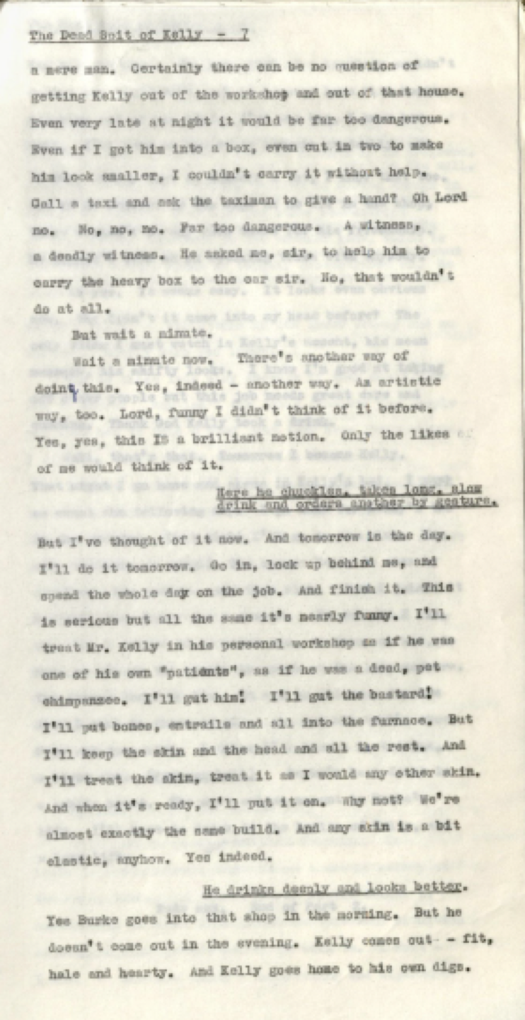 The Bell faltered under the editorship of the radical republican Peadar O’Donnell, who took over from Ó Faoláin in 1946, and eventually ceased publication in 1954. One of the last issues included grisly tale by Myles na Gopaleen that epitomizes the use of comic irony in gothic horror. Titled “Two in One,” a taxidermist’s assistant murders his boss, flays his body, and dons his skin in order to escape, only to get arrested and convicted for killing the now missing assistant—himself. In 1962, O’Nolan wrote a dramatized version for television, calling it “The Dead Spit of Kelly.”