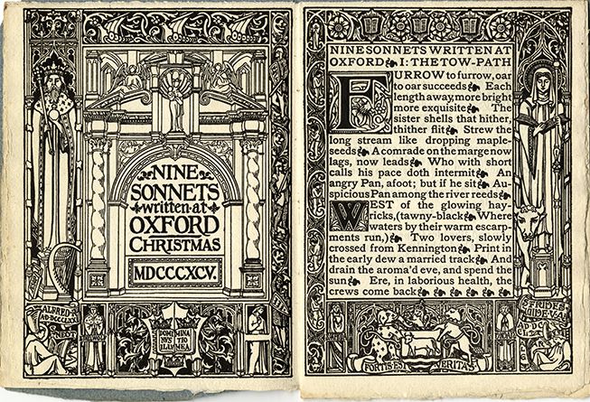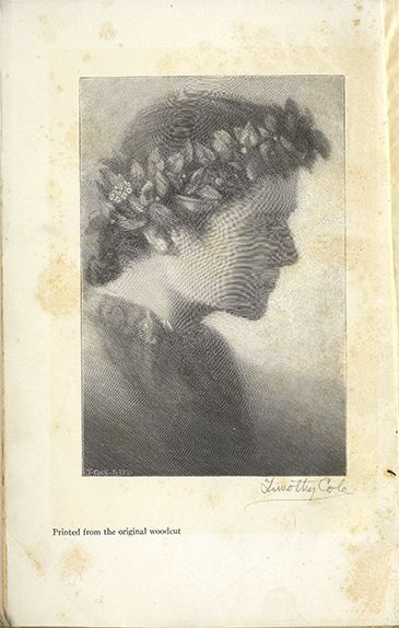 Goodhue designed the title page for Guiney’s Nine Sonnets Written at Oxford, published in 1895 by F. Holland Day and Herbert Copeland. Copeland and Day produced approximately 100 volumes, including several more by Guiney, who served as the firm’s poetry editor. When it closed in 1899, she encouraged Day to devote himself more fully to photography, which he was among the first to champion as an art form. Day’s photographs of Guiney posed as St. Barbara served as models for the engraved portrait of Guiney in Alice Brown’s posthumous tribute.