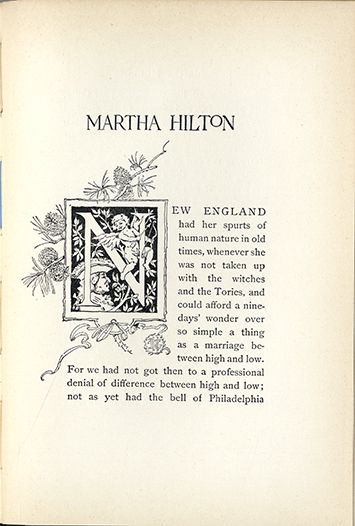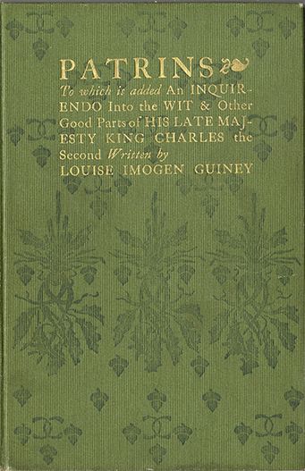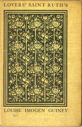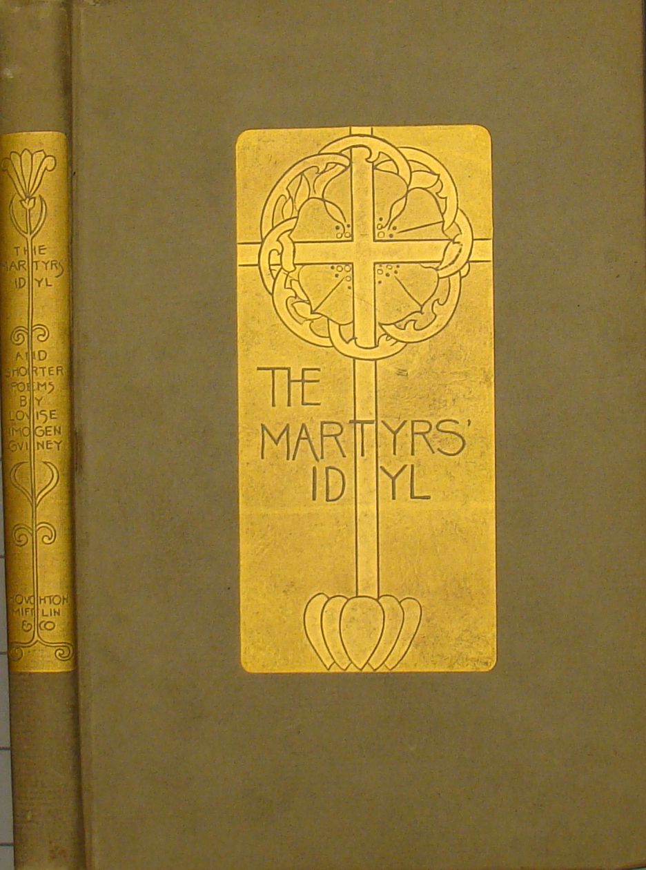 Technology for producing books evolved rapidly in the 1800s. The use of cloth rather than leather as a material for book covers enabled the publishers to experiment with stamped patterns and colors while also making their products more affordable. In the 1880s, the industry moved away from using skilled craftsman to create the metal forms used to stamp decorative motifs, and turned instead to trained artists, including women, to create designs that were then transposed by photomechanical processes onto the engraved blocks used for printing and stamping covers. Such artists created book designs that reflected a range of contemporary aesthetic movements, including Colonial and Gothic Revival as well as Arts and Crafts, as witnessed in the covers and illustrations for Guiney’s books.
