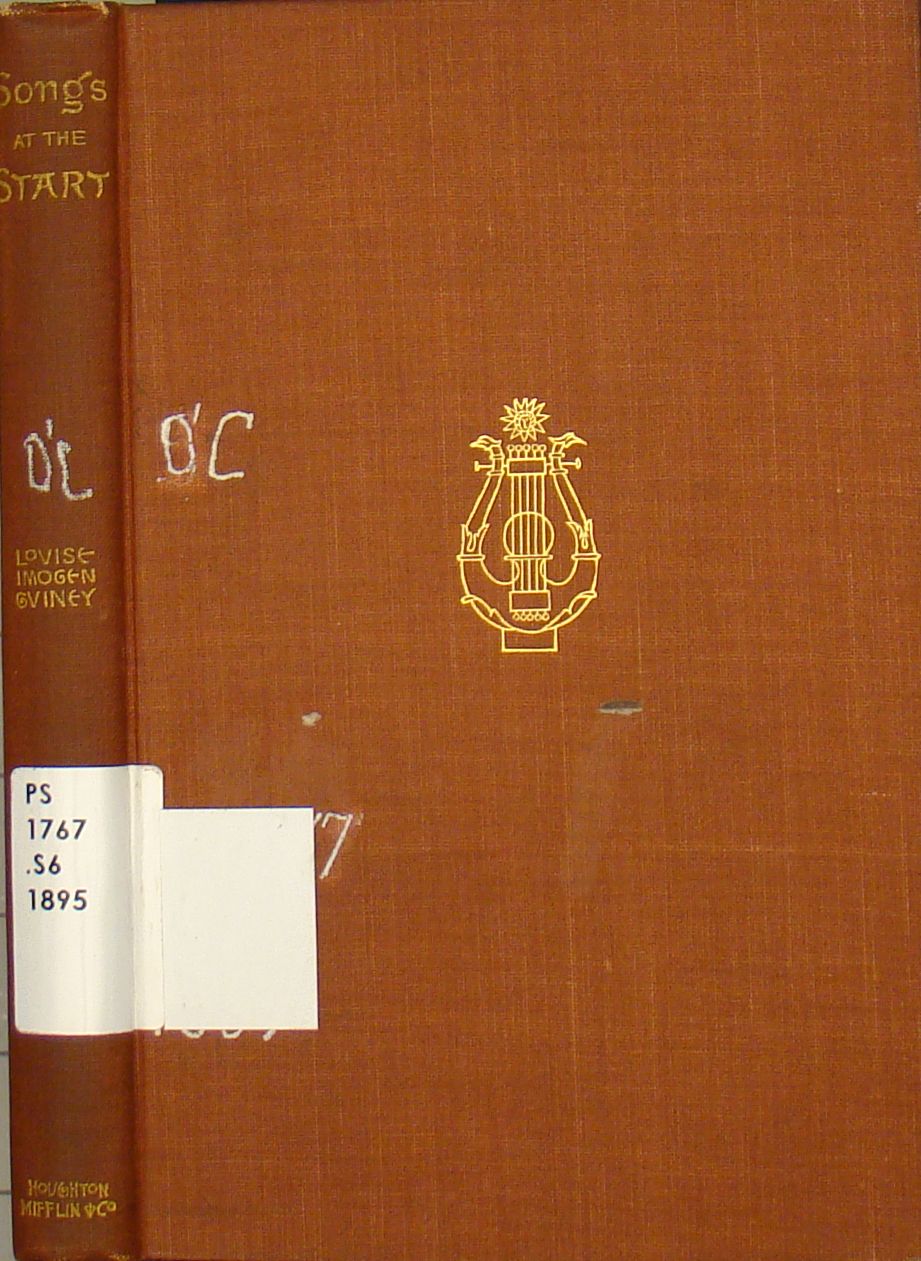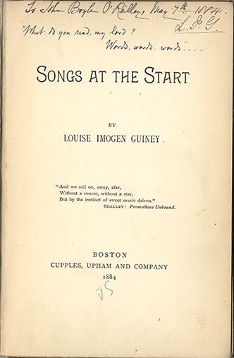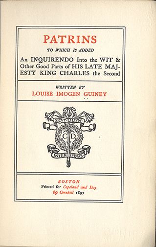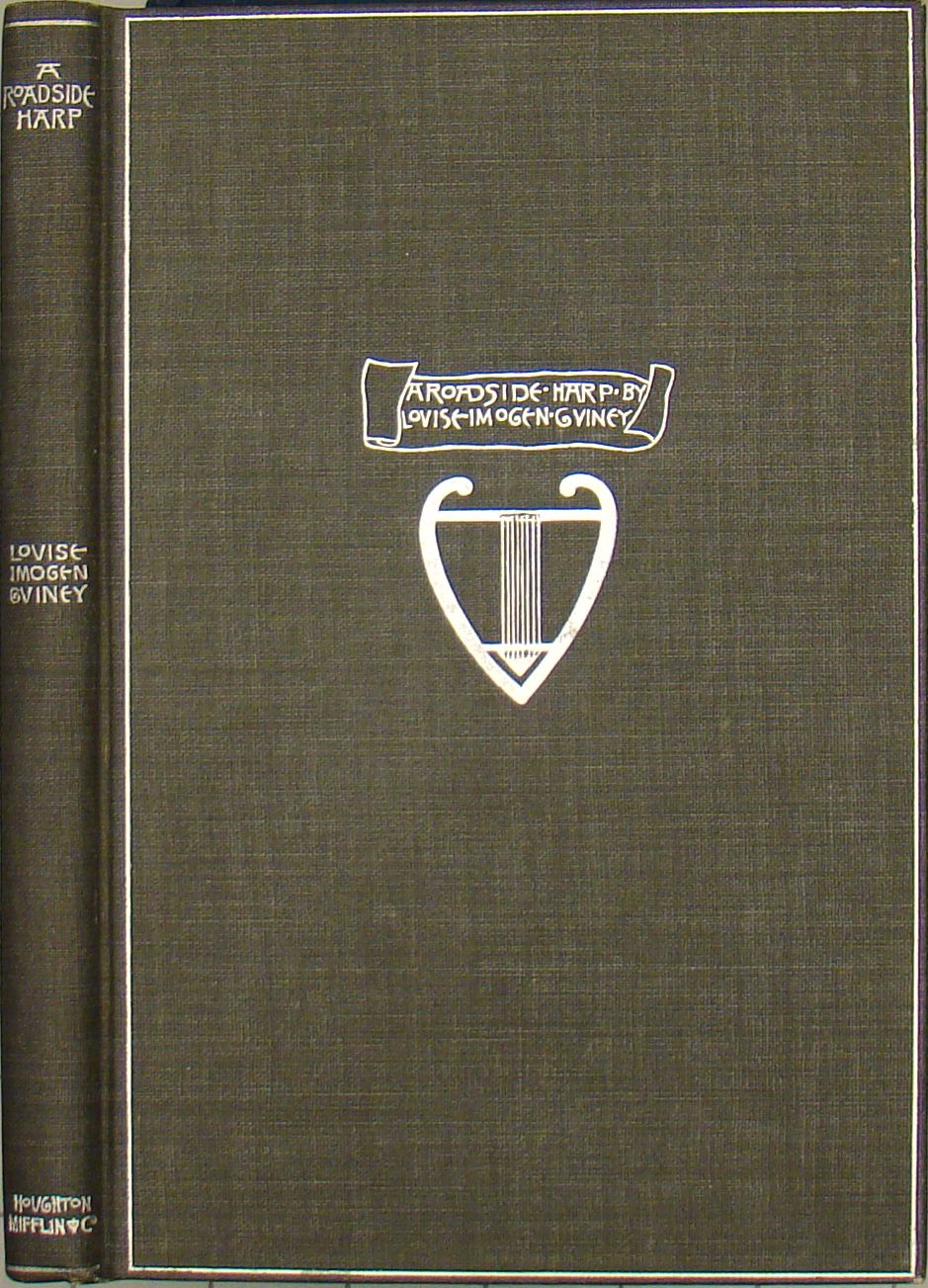 Sarah Wyman Whitman (1842-1904) was a pioneer artist-designer active in the Boston publishing industry during the latter part of the 19th century. Examples of her work shown here, although unsigned, may be recognized and identified by the distinctive lettering style she developed for cover titles. A Boston socialite who knew many of the area’s best-selling authors, Whitman also was acquainted with the publisher George Mifflin, a partner in Houghton, Mifflin and Company, which published three books by Guiney. An adherent of the Arts and Crafts movement, which regarded art and life as inseparable, Whitman created designs for books that were both elegant and affordable in order to provide decorative objects for the home as well as sources of intellectual cultivation for readers. Whitman was a member of the Boston Athenaeum, and met Guiney through their shared Athenaeum connections