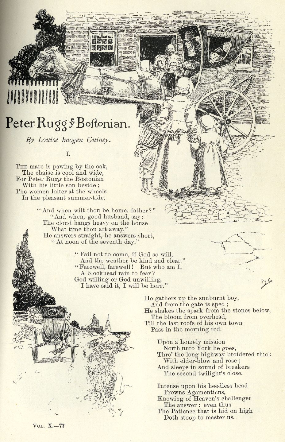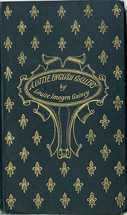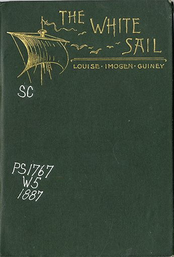 The books in this section, printed between 1885 and 1895, have cover designs that reflect the techniques and styles typical of the period and its emphasis on craftsmanship. Guiney’s collections of poems, Songs at the Start and The White Sail, feature striking ornaments that echo their titles. Her collections of essays, Goose Quill Papers and A Little English Gallery, also boast gold-stamped cover designs that respond to their contents. Illustrations for Guiney’s retelling of the story of “Peter Rugg the Bostonian” and her essay on Martha Hilton reflect a Colonial Revival style in keeping with their Colonial-era subject matters. The increasing care and resources that publishers invested in cover designs, illustrations, and frontispiece portraits for Guiney’s work provide evidence of her growing reputation as a writer as the 19th century came to a close.