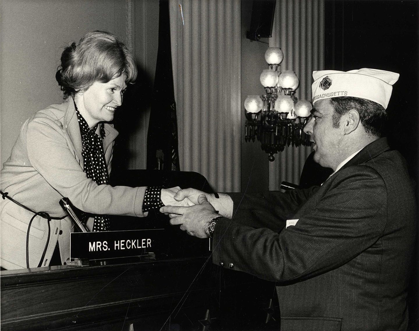 Margaret Heckler shaking hands with a Massachusetts veteran, circa 1977-1979.
