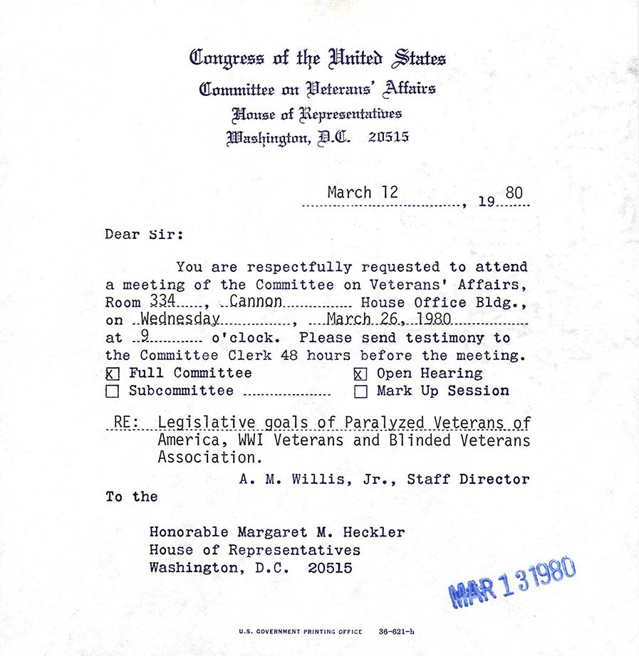 Committee on Veterans’ Affairs meeting notice regarding the legislative goals of paralyzed veterans, March 12, 1980.