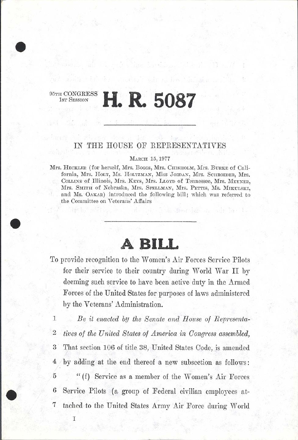 H.R. 5087, a bill to recognize Women Airforce Service Pilots (WASPs) as veterans, sponsored by Margaret Heckler, March 15, 1977.