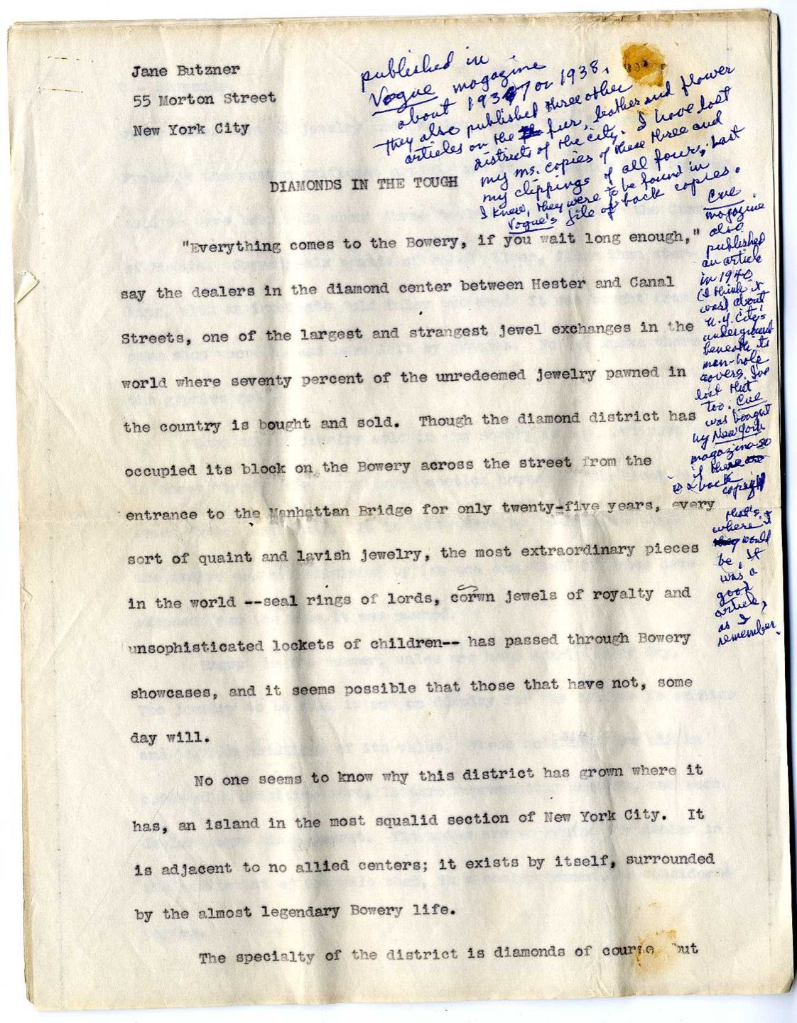 Between 1935 and 1937, Jacobs wrote a series of four articles for Vogue magazine on the fur, leather, diamond, and flower districts of New York City. At a peak of her popularity in the late 1960s, she was to be the subject of an article in Vogue. It never appeared.