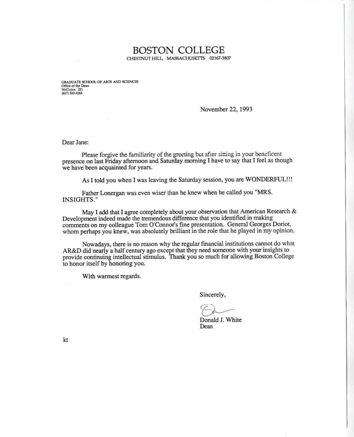 In an enthusiastic thank-you letter following the conference, CSOM dean Donald White referred to the nickname that Bernard Lonergan, SJ, had given her: “Mrs. Insight.”