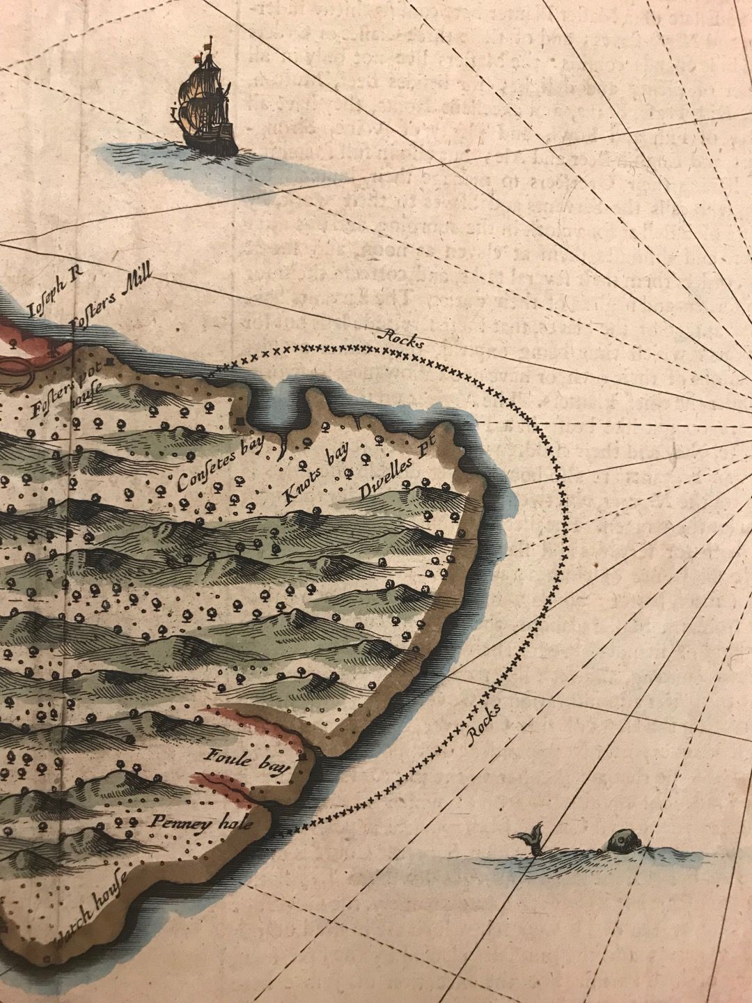 The Williams Collection, in addition to its books, also includes maps and manuscripts. This selection from the collection connects to the theme of “pirate treasures” and includes images of several maps, along with two documents – one, a letter describing the capture of an English privateer in 1682, and the other about the disastrous earthquake of 1692 which devastated Port Royal, Jamaica.