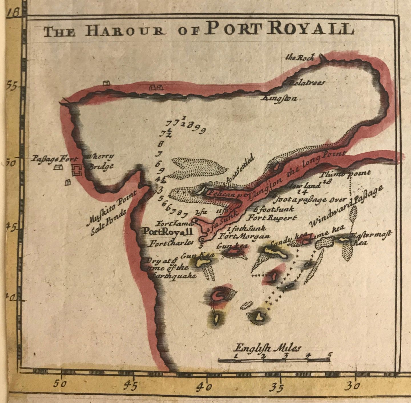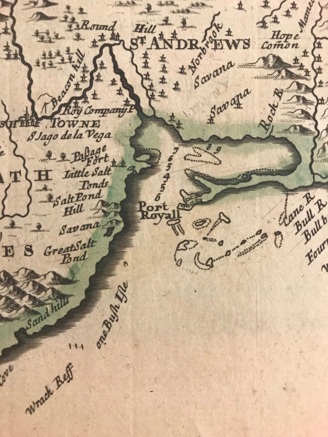 Harris, John, revised by John Senex. A new Map of the Island of Jamaica most humbly inscribed to the right honorable Thomas Earl of Stamford, Etc. with inset map of the harbour of Port Royal. Part of A New Map of the English Empire in the Ocean of America or West Indies. London, 1721. map detail