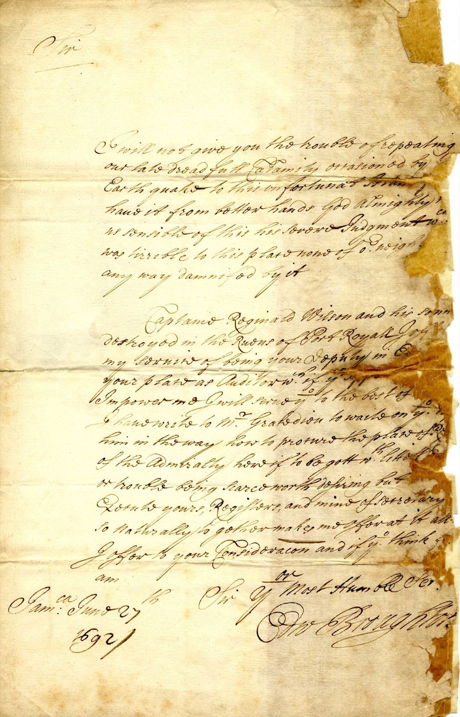 Broughton, William. Letter to William Braithwaite following the 1692 Port Royal, Jamaica earthquake, 27 June, 1692.
