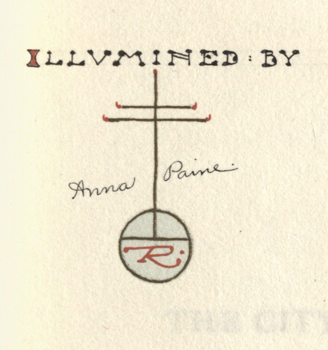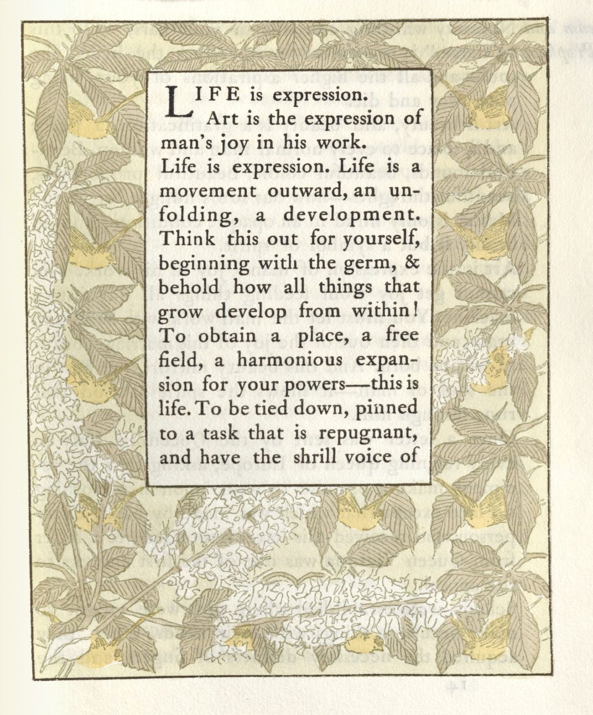 This work contains two preachments—or unwelcome or tedious sermons—by Elbert Hubbard, The City of Tagaste and A Dream and a Prophecy (1900). This full page illustration was hand-illuminated, or decorated, by Anna Paine and contains her signature at the beginning of the text. The leaves and flower are typical of Roycroft design, but the yellow birds are a nice addition.