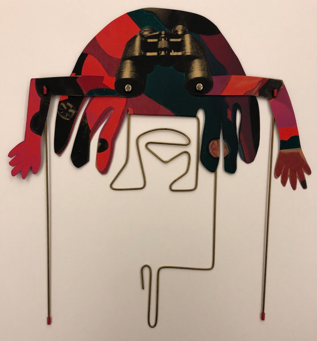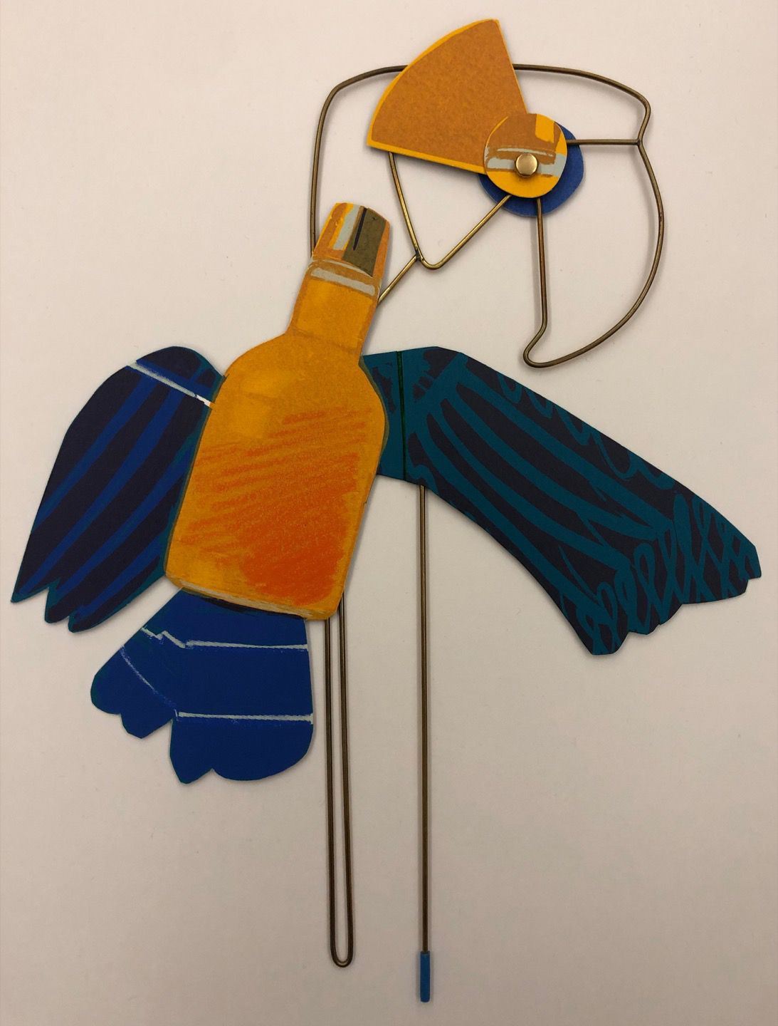 Anansi (the spider trickster), Parrot, and Chicken Hawk are three characters that appear in various tales with roots in both African and Caribbean storytelling traditions. These puppets, from an artist’s book that turns various characters into paper-and-wire figures, occupy the hands of the people who manipulate them, helping to amuse and pass the time.