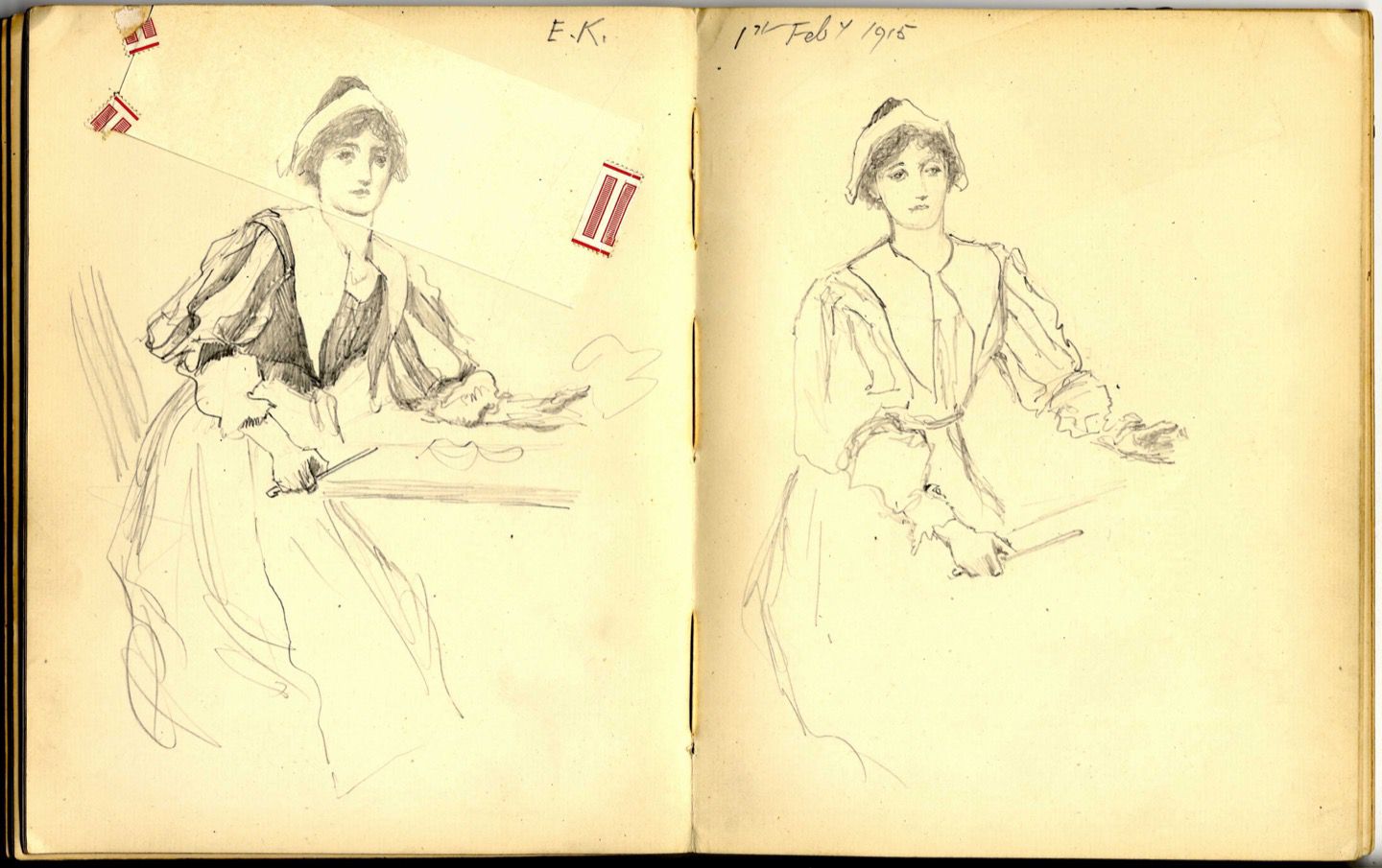 These sketches, almost doodles, by poet Francis Thompson show a lighter side to his life, perhaps a distraction from the work at hand. The pencil sketches of artist Kate Hopkins show more time and care; the corrected drawing emphasizes the mutability of drafts and the intimate relationship between artist and material.